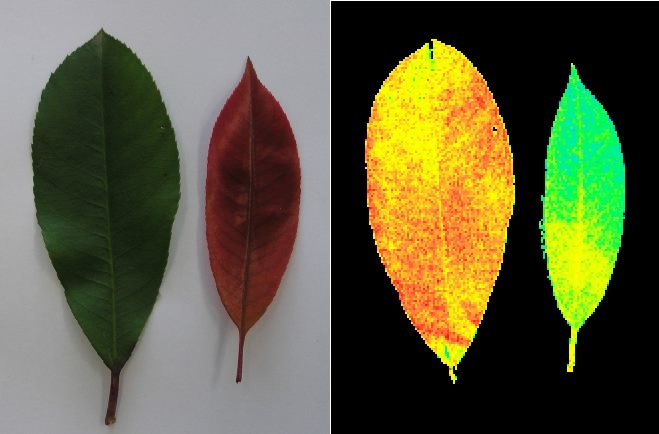 さて、真打ちのモミジ登場です。例によって下の写真の上段は、普通の写真、下段が光合成を可視化したイメージです。この写真ではわかりづらいですが、真ん中と右側の葉を比べると、真ん中の葉の方が緑色をより多く残して濁った赤色になっています。下段の光合成のイメージを見ると、それこそ紅葉のように、左の葉は赤く、真ん中の葉は黄色、右の葉は緑色になっています。これは、赤、黄、緑となるに従って光合成が低下していっていることを示します。この場合も、上のビヨウヤナギと同じで、まずクロロフィルを残したまま、赤い色素が貯まっていき、それからクロロフィルが分解していく、という過程を取っているのでしょう。